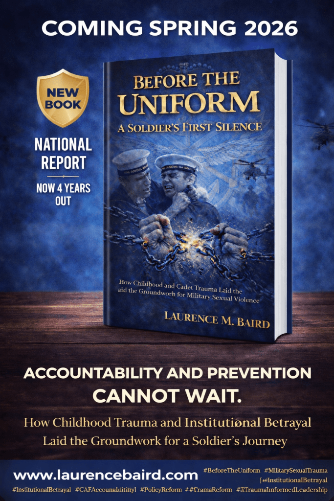 The beginning of Laurence Baird’s story, showing how childhood sexual abuse and his years in the Royal Canadian Sea Cadets shaped his vulnerability, identity, and trust in institutions. It captures both the genuine gifts of cadet life, discipline, leadership, seamanship, and rising to Petty Officer First Class, and the devastating reality that the same system exposed him to further sexual assaults and failed to protect him. Moving beyond memoir, the book examines why cadet and military structures remain unsafe, connects these failures to stalled reforms like those identified in the Arbour Report, and offers concrete, evidence‑based recommendations to protect today’s youth in uniformed programs.