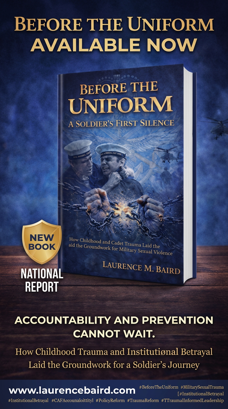 The beginning of Laurence Baird’s story shows how childhood sexual abuse and his years in the Royal Canadian Sea Cadets shaped his vulnerability, identity, and trust in institutions. It captures both the real benefits of cadet life, discipline, leadership, seamanship, and promotion to petty officer first class and the devastating reality that the same system exposed him to further sexual assaults and failed to protect him. The book goes beyond just telling Laurence Baird’s story; it looks at why cadet and military programs are still unsafe, connects these issues to the lack of progress mentioned in the Arbour Report, and provides clear, research-backed suggestions to keep young people safe in uniform